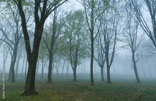 Obraz premium Mysterious mood in the woods on a foggy, spring day.