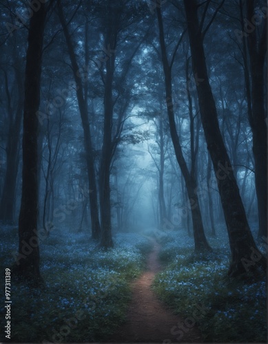 Naklejka premium Mysterious moonlit forest path surrounded by lush blue flowers. Enchanting...