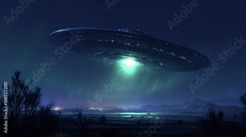 © Oleksandr, Obraz premium Mysterious night scene with a glowing flying saucer hovering over a desert landscape