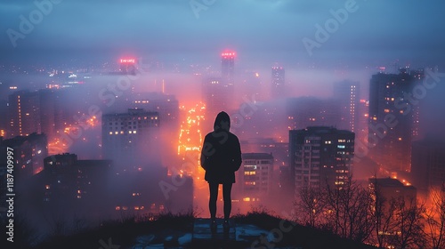 Fototapeta premium Mysterious nighttime cityscape urban setting atmospheric photography foggy environment silhouette viewpoint