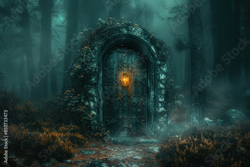 Obraz premium Mysterious old wooden door with glowing light in a misty, enchanted forest, overgrown with vines, surrounded by dense trees and fog.