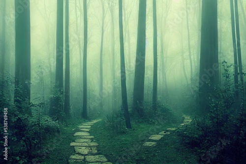 Naklejka premium Mysterious path. Mysterious forest. Road in the forest. Misty forest. Enchanted forest. Fog in the woods. Dark woods.