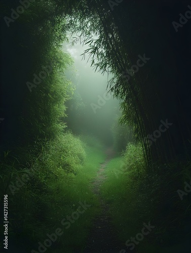 Fototapeta premium Mysterious path through foggy bamboo forest. A tranquil, green escape into...