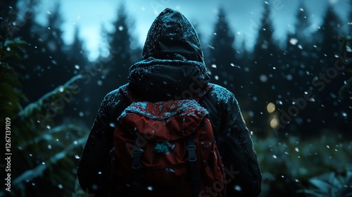 © shadow, Fototapeta premium Mysterious Person In Winter Hood Standing In Snowfall Forest With Red Backpack