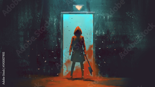 © grandfailure, Obraz premium mysterious person under a red jacket holds an ax in front of the door, digital art style, illustration painting