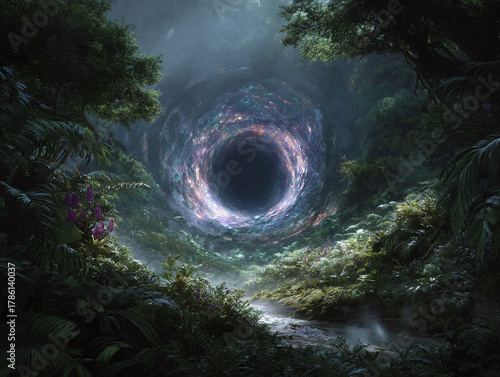 Fototapeta premium Mysterious portal in a lush forest. Evokes fantasy, escape, and the unknown. Perfect for book covers, creative projects, or imaginative concepts.