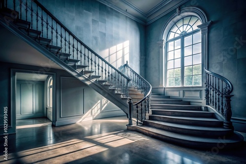 Obraz premium Mysterious shadows cast on a minimalist staircase in a haunted mansion