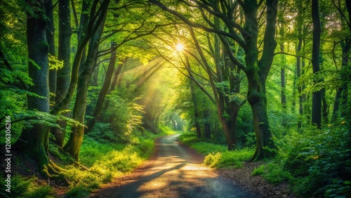 © Arnada, Fototapeta premium Mysterious Shady Forest Trail: Dark Woods Path Leading into Sunlight Stock Photo
