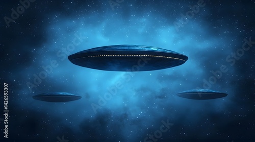 Fototapeta premium Mysterious spacecraft hovering in a starry galaxy long title Futuristic unidentified flying