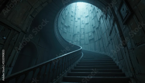 Fototapeta premium Mysterious Spiral Staircase in Dimly Lit Abandoned Structure