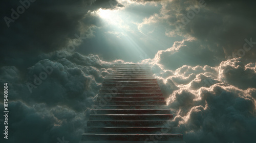 © Daria, Fototapeta premium Mysterious stone staircase ascending through thick, glowing clouds toward a radiant, heavenly light breaking through the dark, dramatic sky above