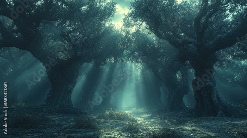 © Umi, Fototapeta premium Mysterious, sunlit path through ancient olive grove, shrouded in mist.
