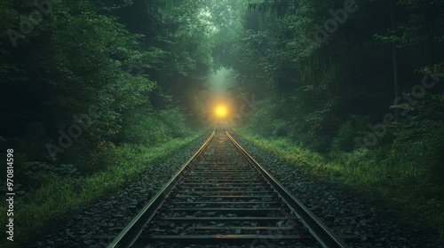 © gen_pick, Fototapeta premium Mysterious Train Tracks Through Misty Forest