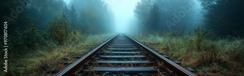 Fototapeta premium Mysterious Train Tracks Through Misty Forest