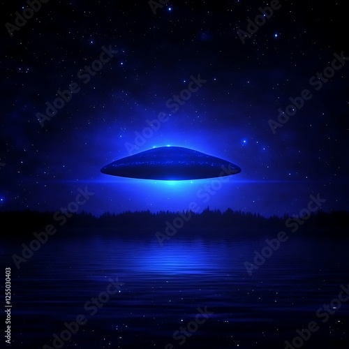 © Big9869, Obraz premium Mysterious UFO Hovering Above Water at Night Under Starry Sky with a Blue Glow Phenomenon Display