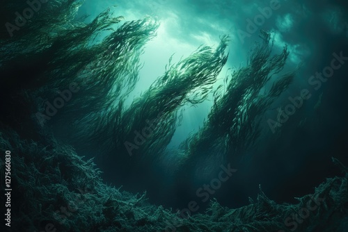 Fototapeta premium Mysterious underwater kelp forest, sunlight filtering through swaying seaweed creating an ethereal scene.