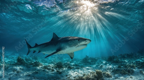 © Artittaya, Obraz premium Mysterious view of shark beneath the waves with sunbeams piercing from above