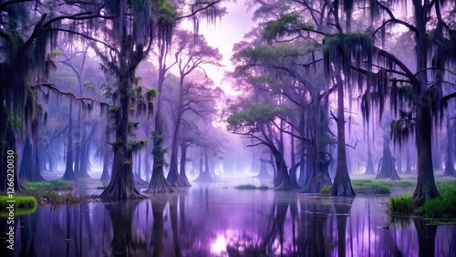 © Nasnunt, Naklejka premium Mysterious violet swamp at dusk surrounded by misty wetlands and towering trees with Spanish moss hanging from branches, creating an eerie atmosphere, swamp scenery, eerie landscape