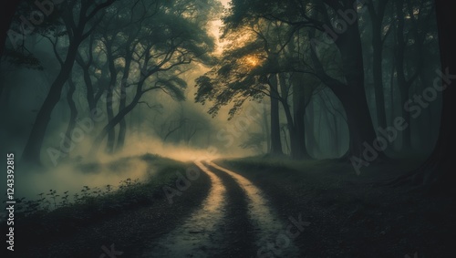 Naklejka premium Mysterious winding path through a foggy forest at dawn invites exploration and adventure