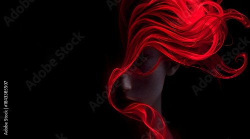 © Prabhash, Obraz premium Mysterious woman emerges from vibrant swirling red smoke with dramatic dark background copy space for design projects