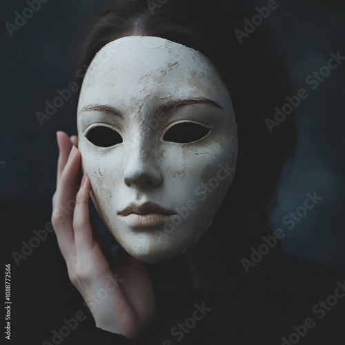 © Ram, Fototapeta premium Mysterious woman holding a white mask, symbolic of hidden identity and emotions, dark and moody artistic photography with dramatic lighting, evocative and thought-provoking concept