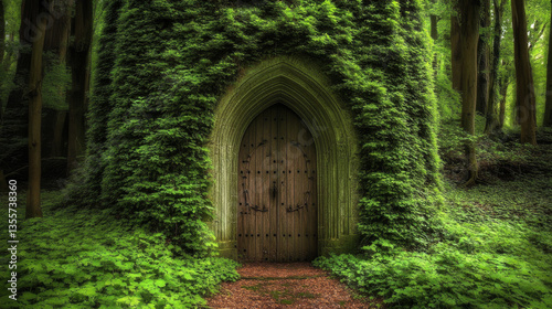 Fototapeta premium Mysterious wooden door in lush green forest setting