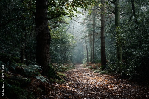 Naklejka premium Mystic Forest Path Through Foggy Woods
