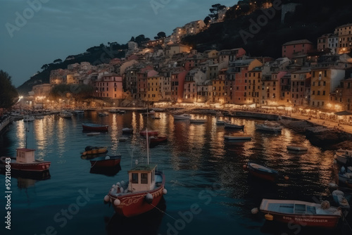 © Novanture, Fototapeta premium Mystic landscape of the harbor with colorful houses and the boats in Porto Venero, Italy, Liguria in the evening in the light of lanterns created with Generative AI technology