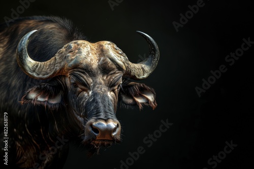 Naklejka premium Mystic portrait of African Buffalo, copy space on right side, Anger,...