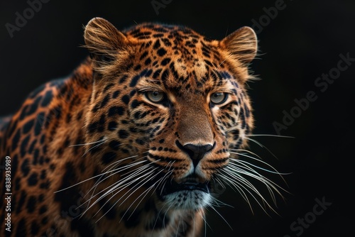 Naklejka premium Mystic portrait of Amur Leopard in studio, copy space on right side, Anger, Menacing, Headshot, Close-up View Isolated on black background