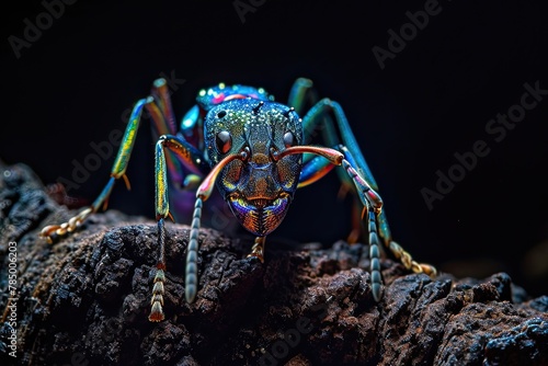 © Eyestetix Studio, Fototapeta premium Mystic portrait of Iridescent Ant on root in studio, The insect's back is visible, full body shot, Close-up View,