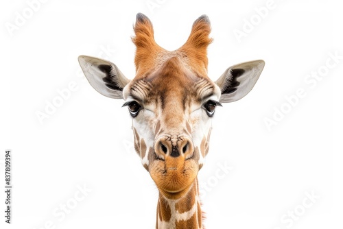 Fototapeta premium Mystic portrait of Northern Giraffe, copy space on right side, Anger, Menacing, Headshot, Close-up View Isolated on white background