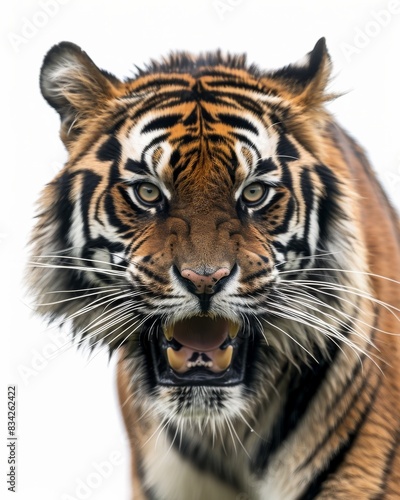 Fototapeta premium Mystic portrait of Sumatran Tiger, copy space on right side, Anger, Menacing, Headshot, Close-up View Isolated on white background