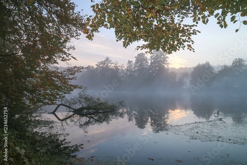 © Lars Gieger, Fototapeta premium Mystic river scenery with morning mist between trees and smooth water with mirror effect in fall.