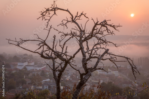 Obraz premium Mystic sunrise over small Bulgarian town - beautiful light through morning mist