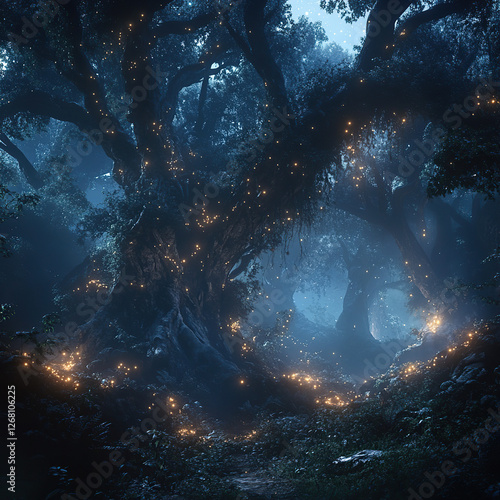 © Mikhail, Obraz premium Mystical Ancient Tree with Fireflies