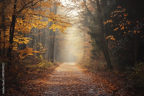 Obraz premium Mystical autumn forest path with fog and golden leaves