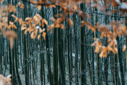 © olezzo, Fototapeta premium Mystical autumn forest with tree trunks and blurred orange foliage in the foreground