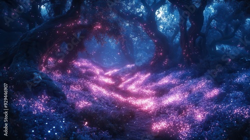 © julija, Fototapeta premium mystical bioluminescent forest at twilight ethereal glowing flora misty atmosphere and otherworldly creatures hidden among twisted trees