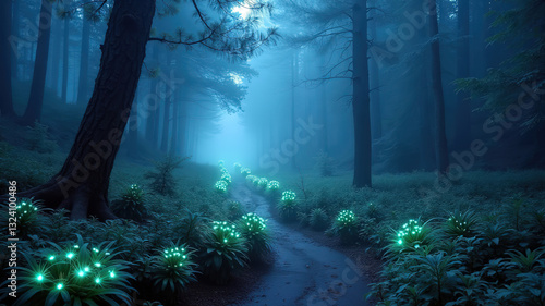 © zobtun, Fototapeta premium Mystical Blue Forest Path with Glowing Flora