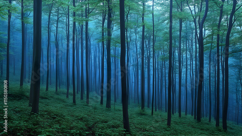© Ahmad, Naklejka premium Mystical blue forest scene at dawn, misty, serene, lush green undergrowth, tall trees.