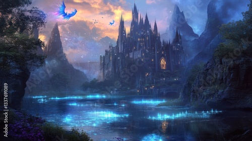© sukrisna, Fototapeta premium Mystical castle by a glowing lake. Dark, majestic, fantasy architecture, tranquil scene