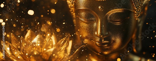 © AS Studio, Fototapeta premium Mystical Close-Up of Golden Buddha Face With Lotus and Glittering Light.