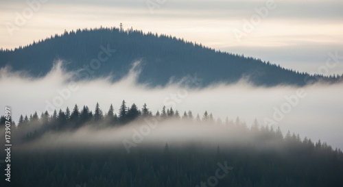 © Muhammad, Fototapeta premium Mystical coniferous forest hills enveloped in ethereal mist and fog