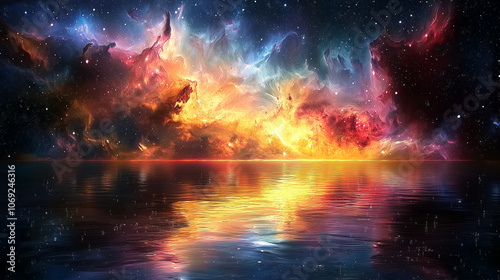 Fototapeta premium mystical cosmic seascape reflecting a celestial nebula, blurring the lines between sea and sky in a fiery glow