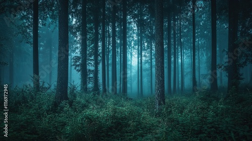 © Windi, Obraz premium Mystical dark forest scene with fog and tall trees.