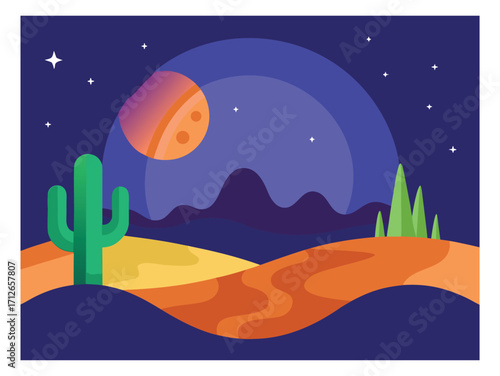 Naklejka premium Mystical Desert Landscape with Cactus Starry Night and Distant Mountains