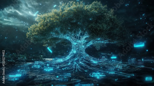 Fototapeta premium Mystical, digital tree of life, intertwining nature and technology. Glowing roots, futuristic interface