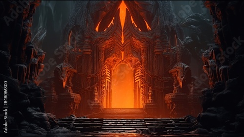 © Wangdi, Obraz premium Mystical dungeon with a gate in the rock and burning torches. Night scene of a monochrome game