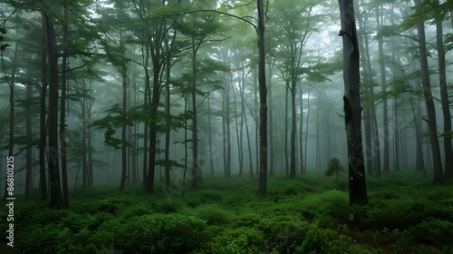 Fototapeta premium Mystical Emerald Forest Shrouded in Misty Atmosphere